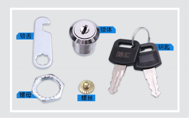 日常中所见到的转舌锁一般有锁舌、锁体、螺母、螺丝和钥匙构成(如下图所示)。